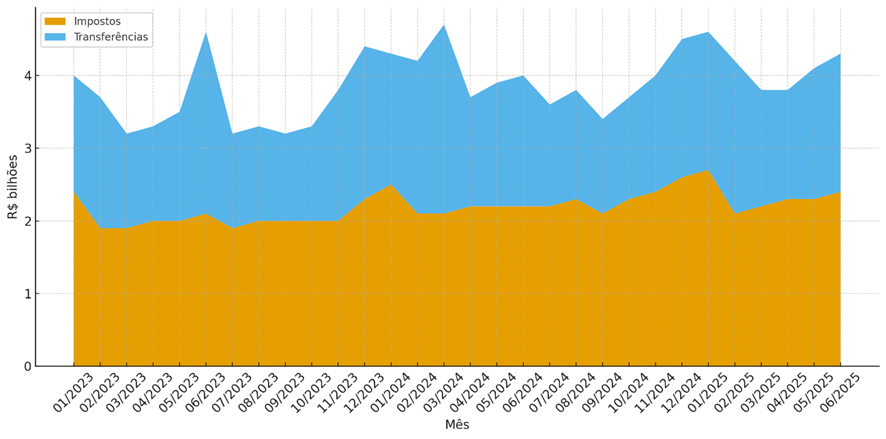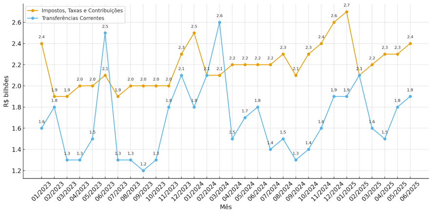 Os dados de 2023 a 2025 revelam um comportamento distinto entre os dois principais componentes da Receita Corrente. A trajetória geral dos impostos é mais estável, enquanto as transferências exibem maior volatilidade e sensibilidade a eventos específicos.