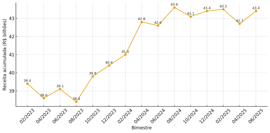 No início de 2025, o comportamento passa a ser mais estável, com pequenas variações ao redor de R$ 43,4 bilhões. No último bimestre disponível (6° bimestre), há um avanço real aproximado de 1,6% em relação ao período anterior, enquanto o crescimento acumulado em 12 meses é de cerca de 1,4%.
